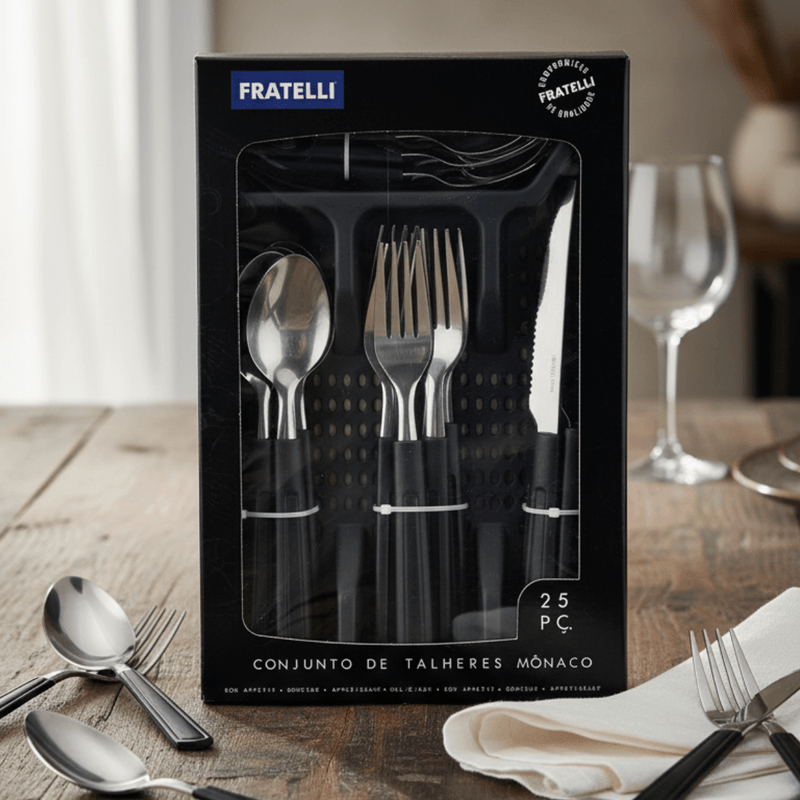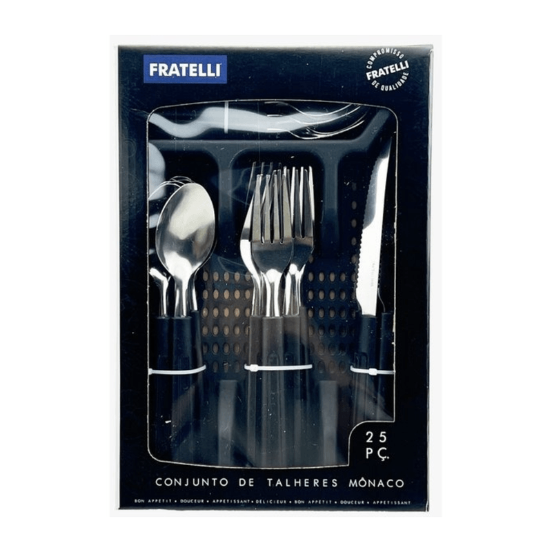 Jogo de Talheres Mônaco 25 Peças Preto - Fratelli | Elegância e praticidade para todas as refeiçõesO Jogo de Talheres Mônaco Preto conta com peças resistentes, modernas e ideais para compor uma mesa prática e elegante no dia a dia. Seu design combina acabamento metálico brilhante com cabos na cor preta, criando um visual sofisticado para qualquer ocasião. Perfeito para uso doméstico ou profissional, o conjunto oferece funcionalidade, durabilidade e organização em uma única embalagem.