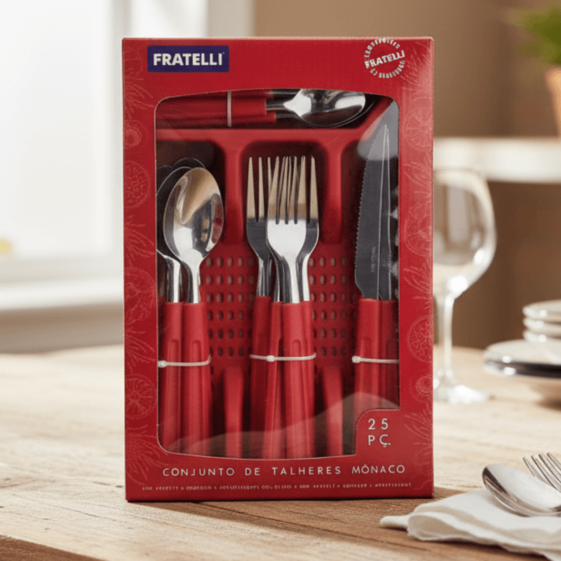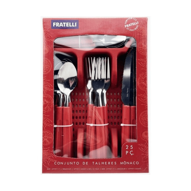 Jogo de Talheres Mônaco 25 Peças Vermelho - Fratelli | Elegância e praticidade para todas as refeiçõesO Jogo de Talheres Mônaco Vermelho conta com peças resistentes, modernas e ideais para compor uma mesa prática e elegante no dia a dia. Seu design combina acabamento metálico brilhante com cabos na cor vermelha, trazendo um toque de estilo e vivacidade para qualquer ocasião. Perfeito para uso doméstico ou profissional, o conjunto oferece funcionalidade, durabilidade e organização em uma única embalagem.