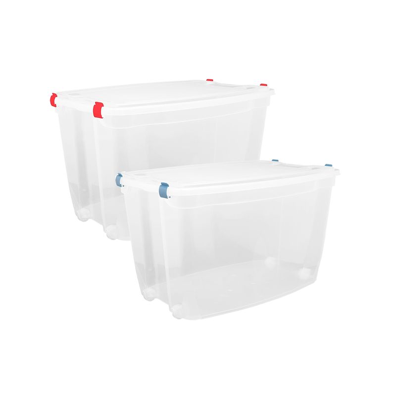 O Kit 2 Caixas Organizadoras com Rodízio Alta 78L possui alta resistência, fechamento com 4 travas, 4 rodinhas para maior comodidade na hora do transporte. Sua tampa possibilita o empilhamento. Ideal para organização em geral.